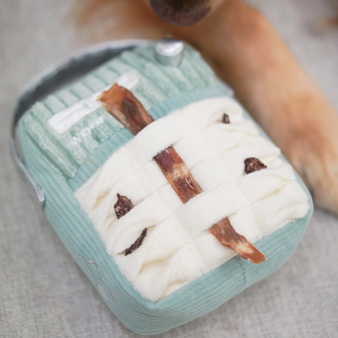 Woof FM combine le jeu de fouille avec des sons surprises — un tapis de fouille à l'avant, une poche de fouille à l'arrière, et un "autocollant" en forme de signe de paix qui couine pour un plaisir supplémentaire.